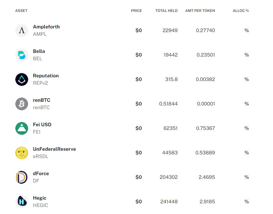 该指数通过市值查询 CoinGecko API 以获取顶级 DeFi 协议列表。非基于以太坊的协议、稳定币和合成资产不包括在列表中。排名前八的协议被选中并在指数中具有同等权重。该指数每月重新平衡以包括任何新代币并重新分配权重。当 DFI 代币被销毁时,所有者会收到等量的组成代币。