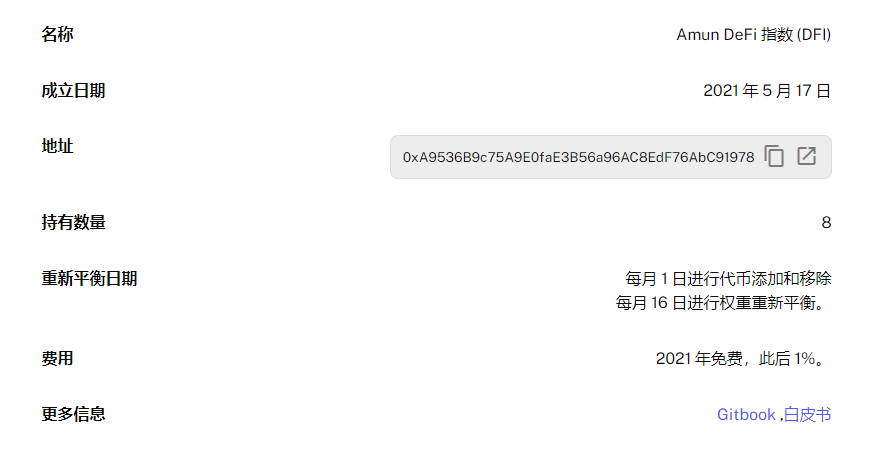 Amun 的 DeFi 指数代币 (DFI) 由以太坊生态系统中市值排名前八的 DeFi 代币组成。DFI 为投资者提供接触协议的机会,这些协议中,包含提供交易、借贷、收益农业、数据预言机、保险、预测市场和合成资产等方向。该指数的成分权重相等,并每月重新平衡。DFI 持有者拥有部分基础代币,可以通过销毁指数代币来赎回。