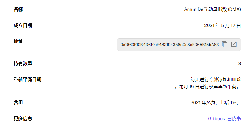 Amun 的 DeFi Momentum Token (DMX) 由以太坊生态系统中基于价格动量排名前八的 DeFi 代币组成。DMX 持有的领域包括交易、借贷、收益农业、数据预言机、保险、预测市场、合成资产、稳定币,有时还有其他符合纳入标准的指数或篮子代币。该指数的成分权重相等。持有成分每天根据需要重新平衡,持有权重每月重新平衡。DMX 持有者拥有部分基础代币,可以通过销毁指数代币来赎回。