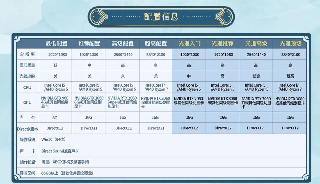 2、配置更新,《仙剑奇侠传7》光追入门配置降低