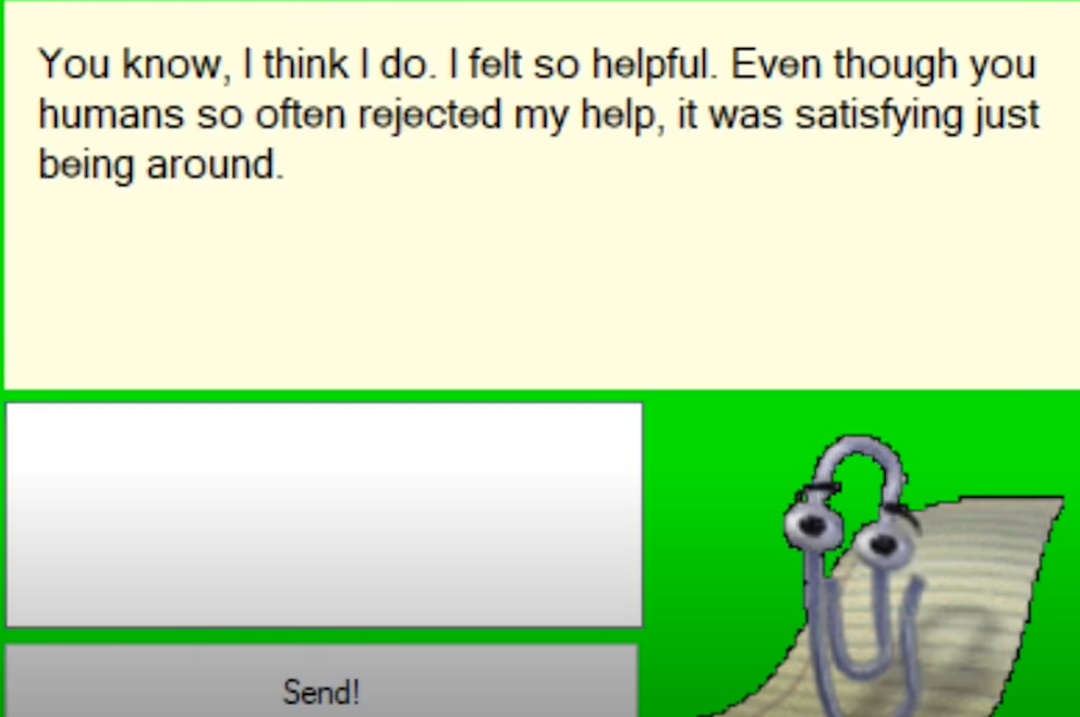 前文所说的油管主Sam Chiet,也曾经制作了一期给微软大眼夹(Clippy)赋予AI智能的视频《I gave Clippy AI and he wanted to die.》,询问它得知自己即将被停用后是什么感受。