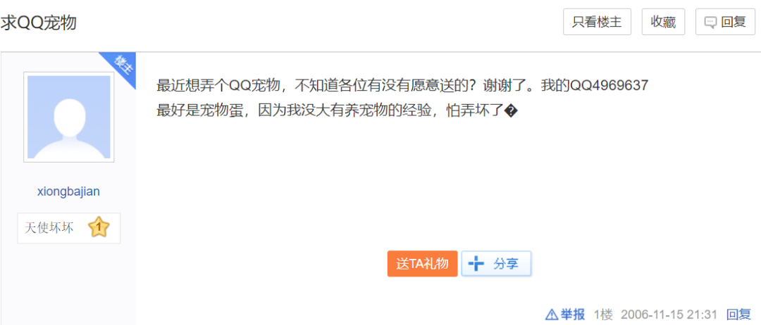 QQ宠物上线之初,除去少部分玩家能够得到官方赠送的宠物蛋之外,其它玩家就只能通过氪金、好友赠送或活动砸蛋领取,所以当时的论坛和贴吧涌现了一批“重金求子”帖子