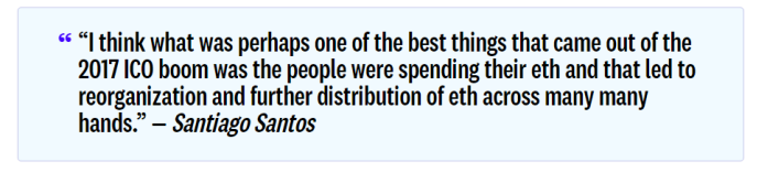 "我认为,2017年ICO热潮中出现的最好的事情之一也许就是人们在消费他们的eth,而这也导致了重组以及eth在许多人手中的进一步分配。" - Santiago Santos