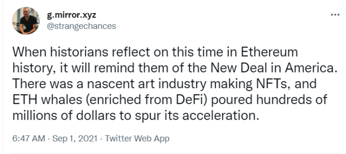 “当历史学家回顾以太坊历史上的这段时间时,会让他们想起美国的新政。当时有一个新兴的艺术产业在制作NFT,而ETH鲸鱼(从DeFi中致富)倾注了数亿美元来刺激其加速发展。”