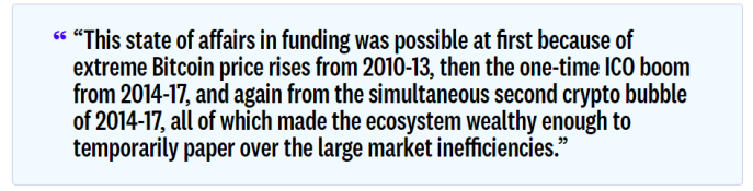 “资金方面的这种状态之所以能够出现,起初是因为2010-13年比特币价格的极端上涨,然后是2014-17年的一次性ICO热潮,接着是2014-17年出现的第二次加密货币泡沫,所有这些都使生态系统变得足够富裕,从而暂时掩盖住了巨大的市场低效。”