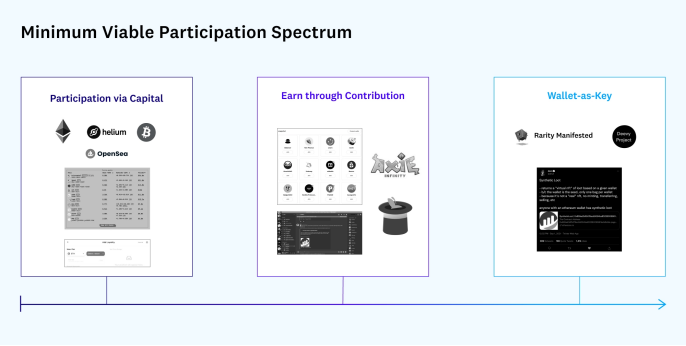 把这个问题放在一个图谱上可能会有帮助,即我们今天的情况,以及我们可能希望在未来看到更多的东西。在图谱的一端是通过资本参与。这就是我们在加密货币网络、DeFi参与和NFT交易的新兴时代所看到的。中间的则是发展中的形式--从通过参与工作组赚取DAO代币,到向DAO提交特定工作的建议,到为Discord上的讨论做贡献,到完成Rabbithole上的任务,到像Axie Infinity这样的游戏来赚取。而在另一端是刚刚开始实现的形式:首先通过拥有一个钱包来参与加密世界。
