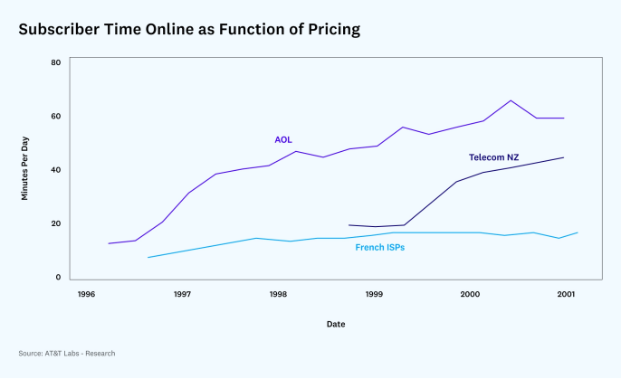 但大多数互联网的早期用户很幸运地看到了价格的每年下降。1996年,美国在线从对使用量敏感的价格转为统一价格,这不仅推动了更多消费者采用互联网,而且还带来了更多的上网时间。
