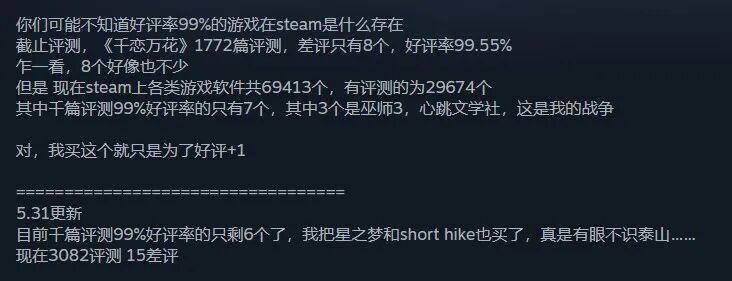 但这或许也只是所谓的“幸存者偏差”。毕竟会选择购买游戏的大多都是做好了心理预期,能够接受本作的玩家。至于接受不了的,大部分都选择不购买,自然也没有评论的机会。