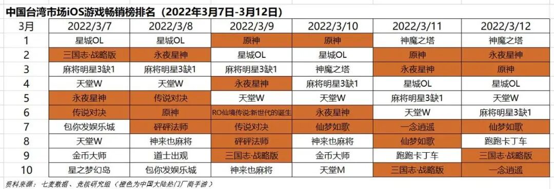 中国台湾市场2022年3月7日—3月12日iOS游戏类畅销榜中,米哈游《原神》登顶两日。