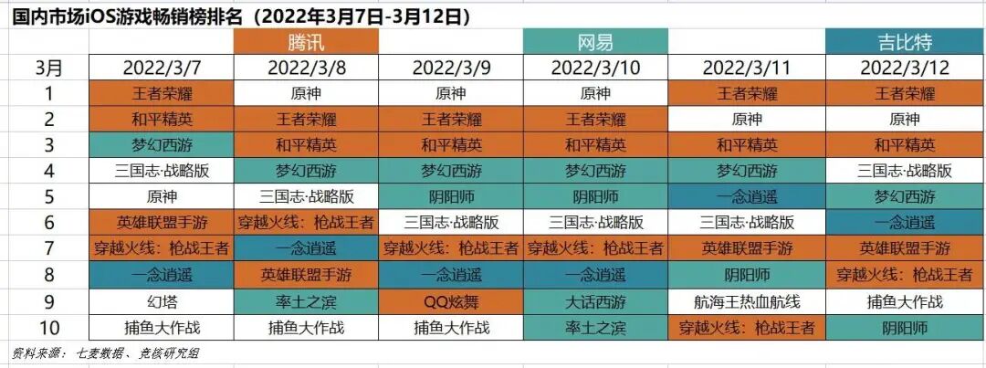中国大陆市场2022年3月7日—3月12日iOS游戏类畅销榜中,《王者荣耀》、《原神》交替登榜。