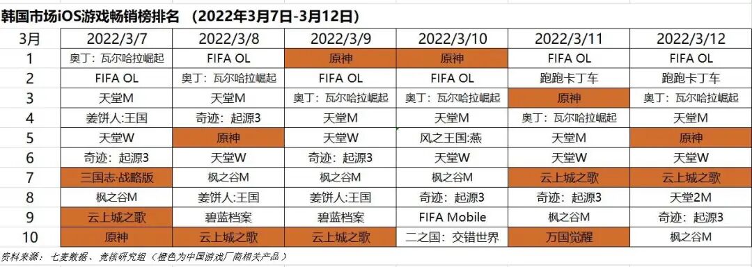 2022年3月7日—3月12日韩国iOS游戏类畅销榜中,米哈游《原神》有两日登顶。灵犀互娱《三国志·战略版》、莉莉丝《万国觉醒》进入榜单。三七互娱《云上城之歌》通过本地化运营,受到韩国玩家喜爱。