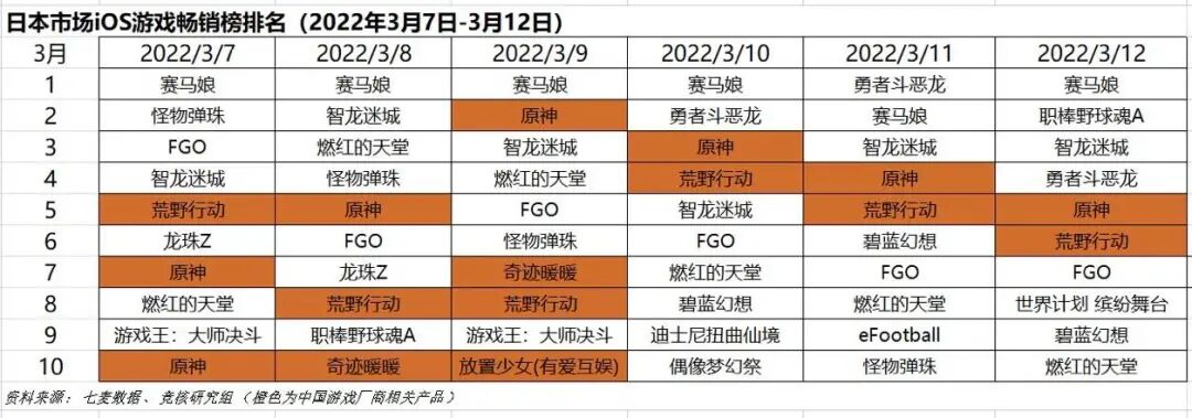 2022年3月7日—3月12日日本iOS游戏类畅销榜中,米哈游《原神》、网易游戏《荒野行动》进入榜单。《燃红的天堂(Heaven Burns Red)》持续在榜。