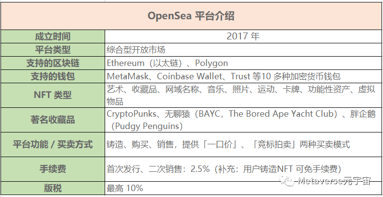 OpenSea 为目前全球最大的NFT 平台,创办人为Devin Finzer 和Alex Atallah,平台相关投资者包含Binance、Coinbase、Paradigm(加密风投机构)以及Coatue Management(对冲基金) 等之知名机构。OpenSea 于2022 年完成C 轮融资,其平台估值上看130 亿元以上,为目前新手最容易上手的NFT 平台。