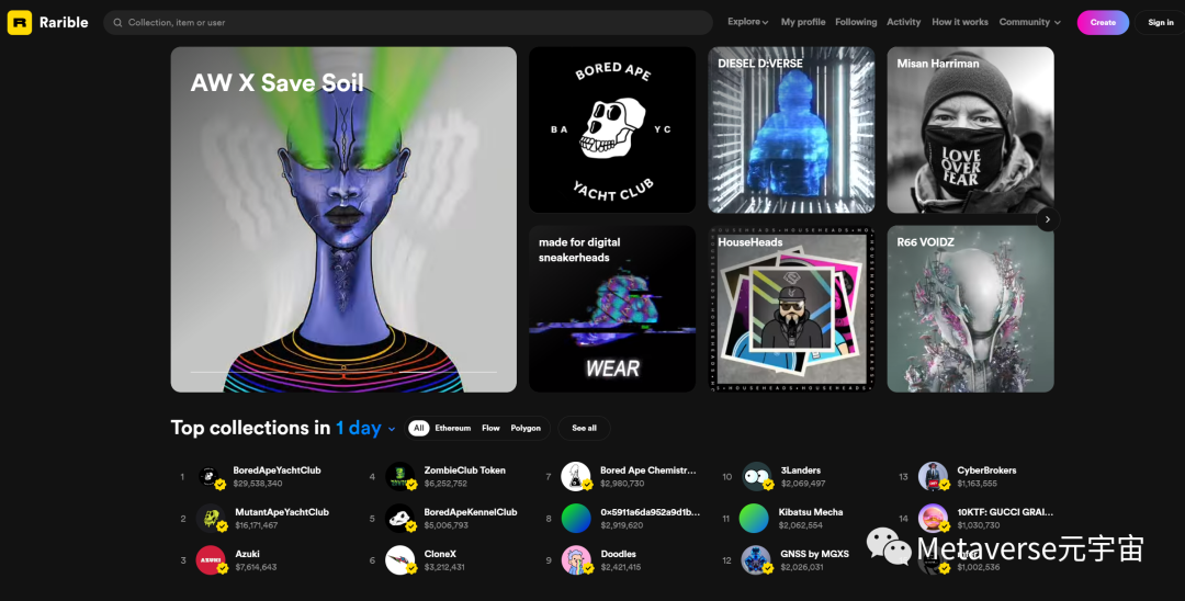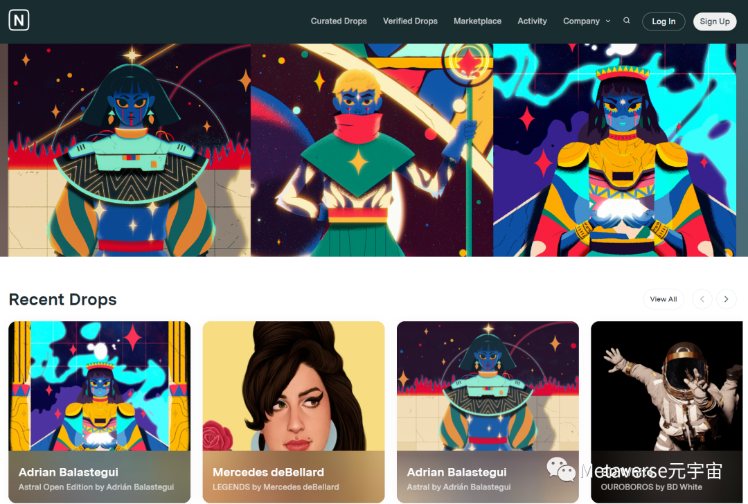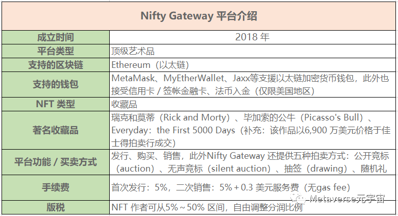 「We will not rest until 1 billion people are collecting NFTs.」为Nifty Gateway 的核心精神,主要瞄准顶尖的艺术收藏品市场,创办人为兄弟档Cameron Winklevoss 和Tyler Winklevoss,于2019 年被加密货币交易所Gemini 收购,并在此架构下延伸出多元的交易方式,以及更安全的资金托管方式。Nifty Gateway 平台最大的特色在于:严格审视每一位艺术家及创作者,在核准发行NFT 作品前,须先通过如简短影片介绍、列举中长期目标等一系列审查。