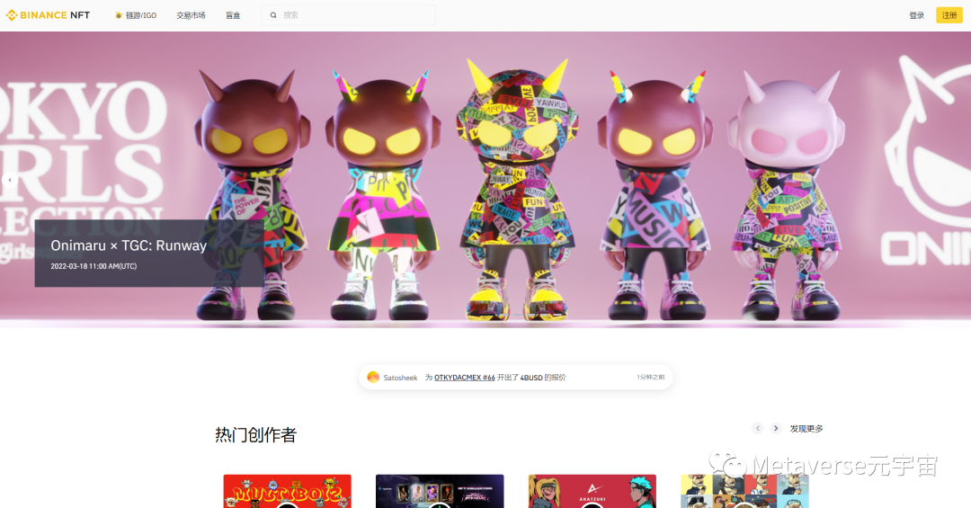 说到加密货币平台,大家一定会先想到Binance ,也是目前全球最大的加密货币交易所,同时Binance 也有推出自家的NFT 平台——Binance NFT。Binance NFT 类似OpenSea,提供多样化的NFT 类型,且用户可自由上架、购买、出售NFT,而最便宜的NFT 价格也只要价几百元新台币,相当适合作为新手入门。最后,Binance NFT 平台还有以下四大优点:能接受以太链之外的区块链、允许多种加密货币买卖、手续费较亲民、全中文化介面。