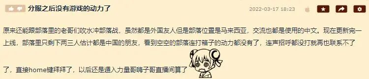 有网友表示,如果某国服玩家加入了一个全是国际服玩家的部落,在国际服玩家的视角中,这位国服玩家的信息将被删除,而在国服玩家的视角中,他将成为一个新部落的唯一成员。由于事发突然,许多国服玩家都没能来得及与部落中的国际服玩家道别,这也成为他们心中一个小小的遗憾。