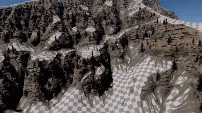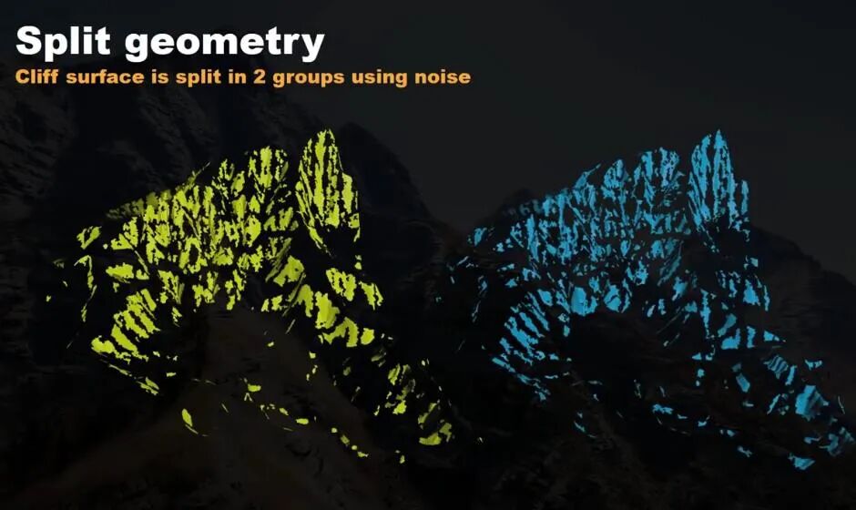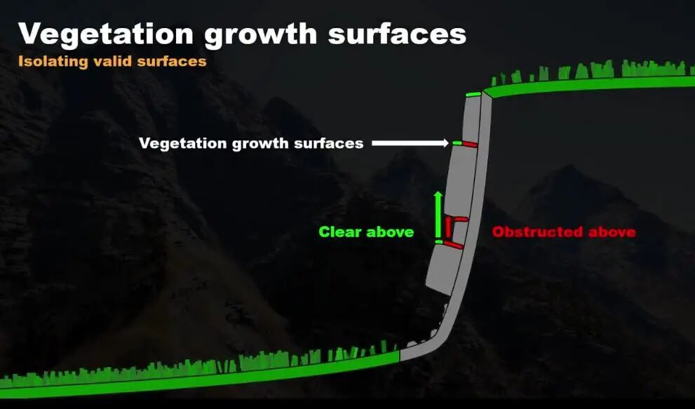 我们还可以在悬崖表面分布植被,我们检测的方式是将面朝上的悬崖单独分离,然后可以在这些悬崖表面分布树木和其他植物,如图所示。