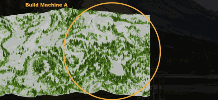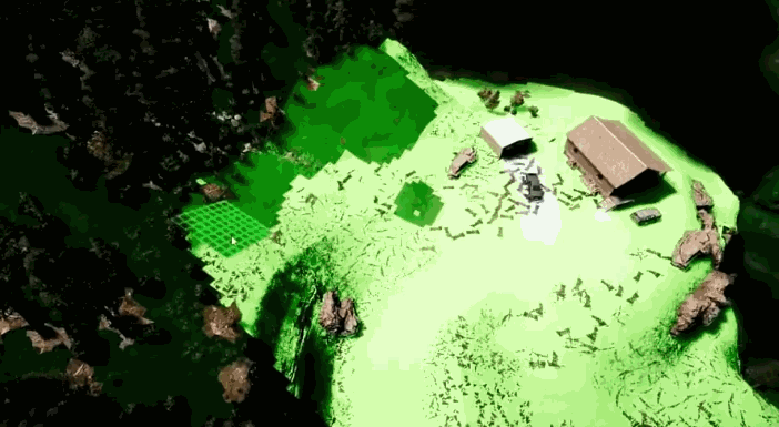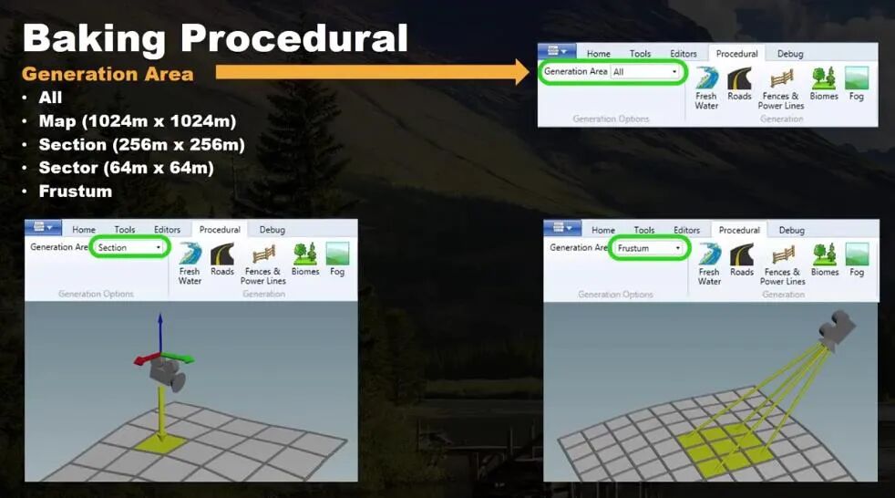 第一个目标就是打造微观管理工具,用更加自然的游戏内容填充到游戏世界当中。然后,这些内容需要与地形拓扑(terrain topology)一致,比如这是同一个案例,但植被完全按照地形的变化进行分布。