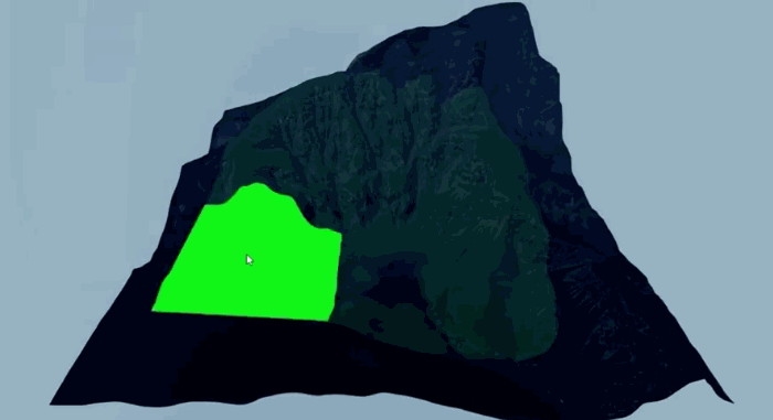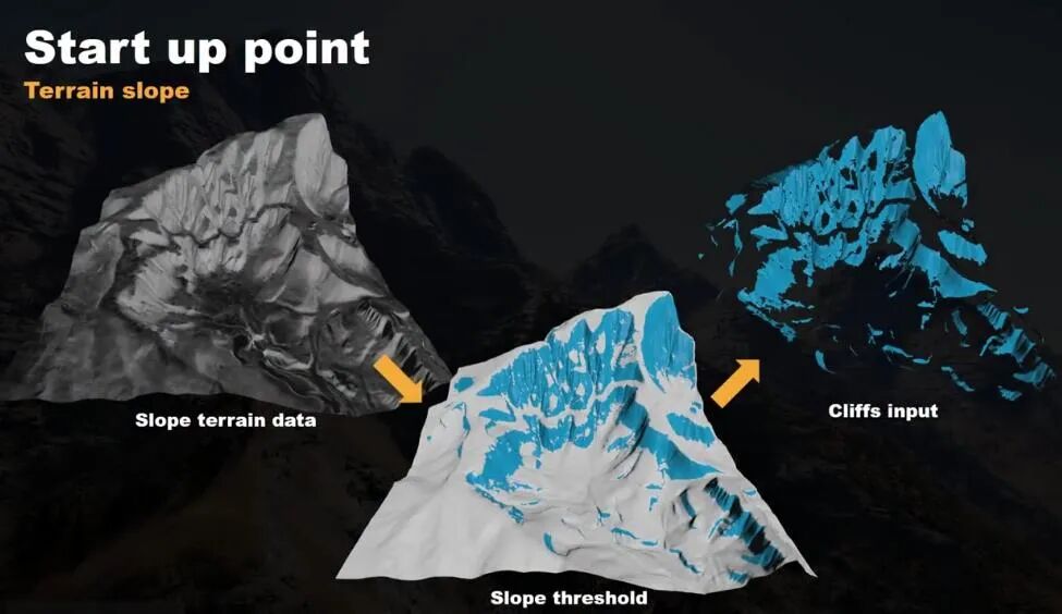 我们实际上是通过使用Terrain slope作为起始点,并且在特定的坡度阈值之内删掉了所有的表面,如右侧缩减,这就是悬崖输入几何体,这种几何体还给玩家视觉提醒,这里有悬崖,是不能在上面行走的。