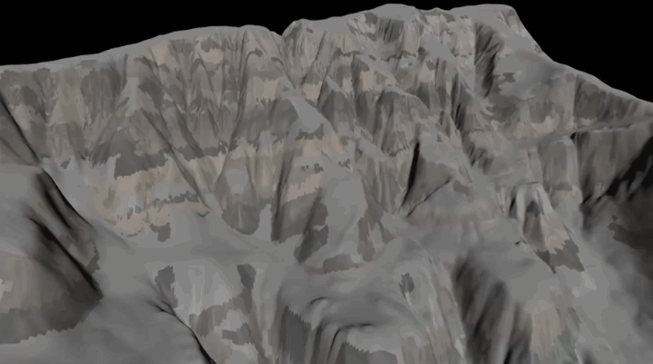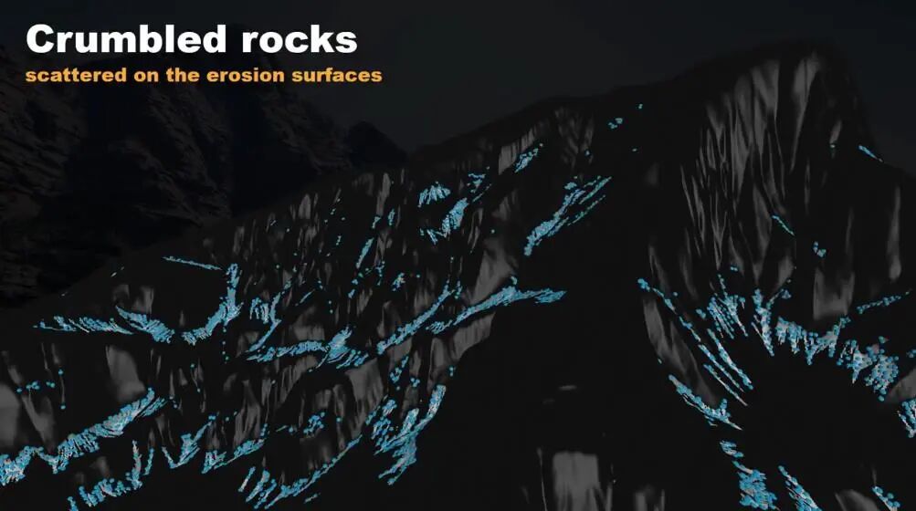 从我们转移到地形上的cliff mask,我们通过运行缓慢模拟的方式对悬崖进行拓展,我们可以看到分散于悬崖表面的点向下滑落以适应腐蚀效果,值得注意的是,原来的颜色依然保持在腐蚀区域。