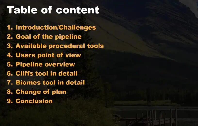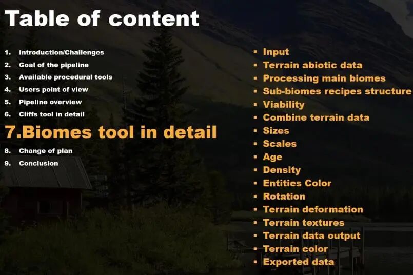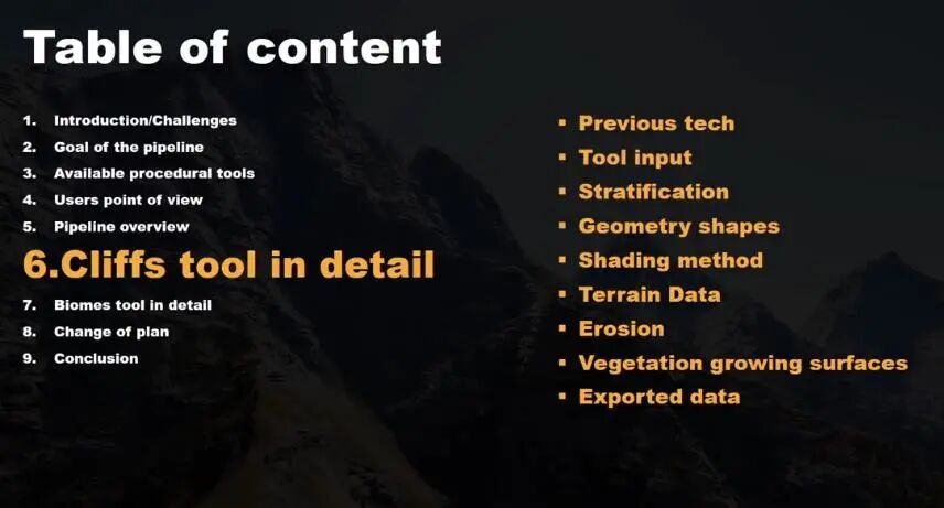 随后我们会对这个管线进行更多的了解,然后详细介绍Cliff和biome工具,接着会说一些研发过程中做出的改变,最后是总结部分。