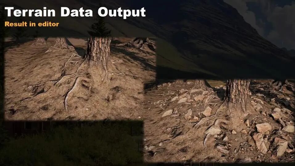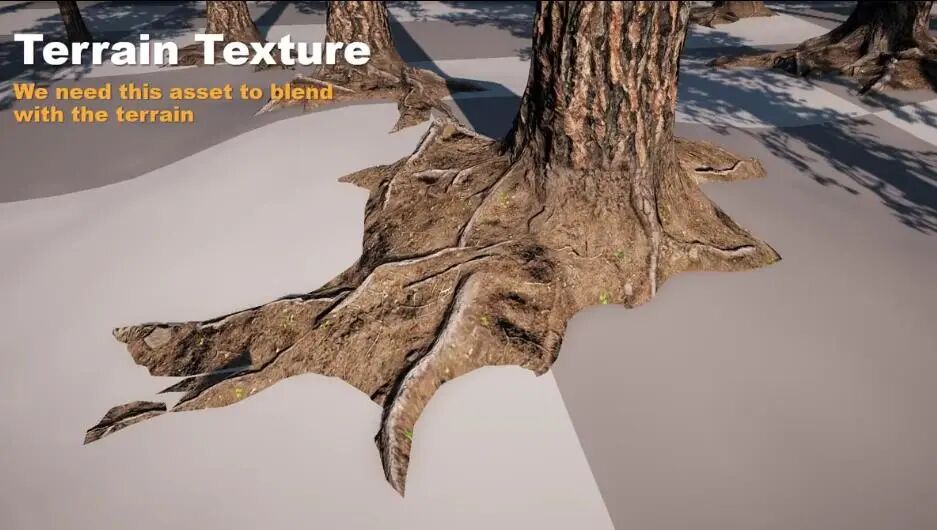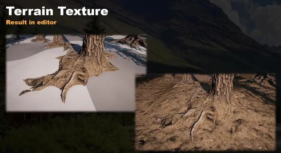 接下来近距离看看这些树根,我们非常希望它们与地形无缝融合,可以通过生成匹配的地形纹理来实现。