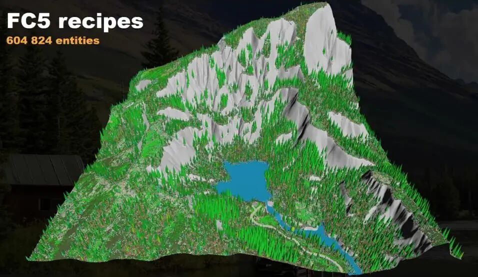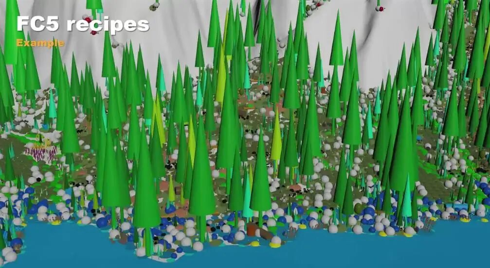 《孤岛惊魂5》的一个地图是一平方公里,这样的一个地图当中有60多万个单位分布,都是通过biome工具程序化生成的。实际上,我们在游戏里增加了大概70张这样的地图,以组成一个栩栩如生的完整世界,所以生成的资源量很大。