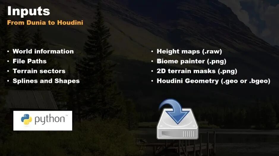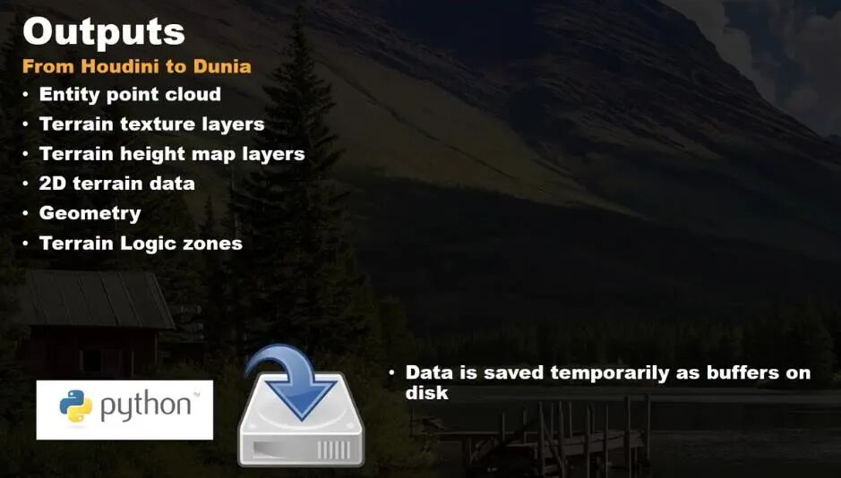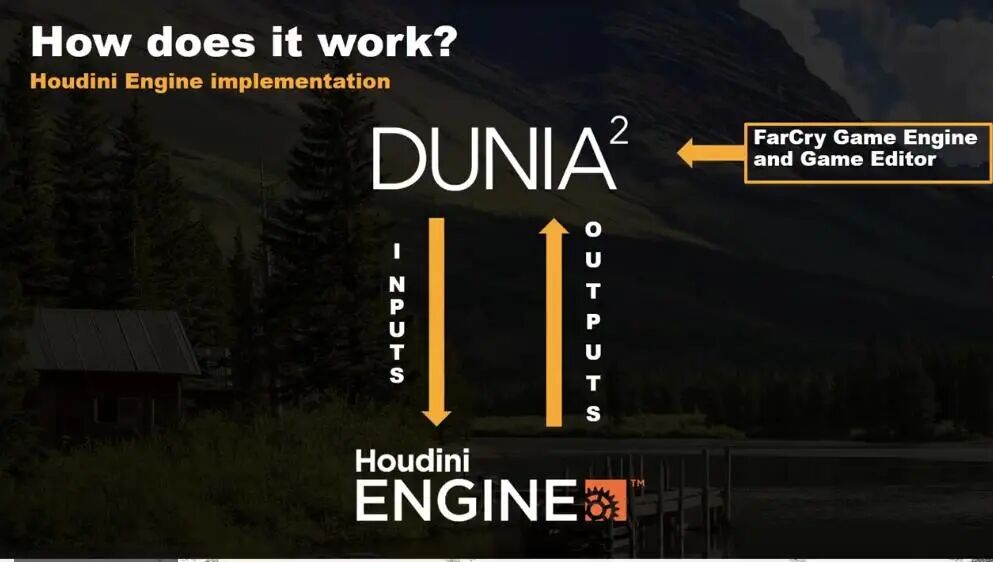 接下来我们看所有工具在Houdini引擎是如何工作的,我们使用了内部引擎DUNIA作为输入,然后通过Houdini输出,基本上是在两个引擎之间交换数据。
