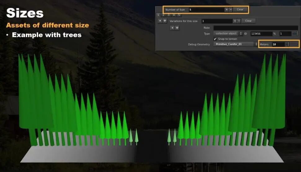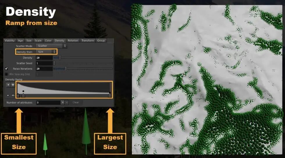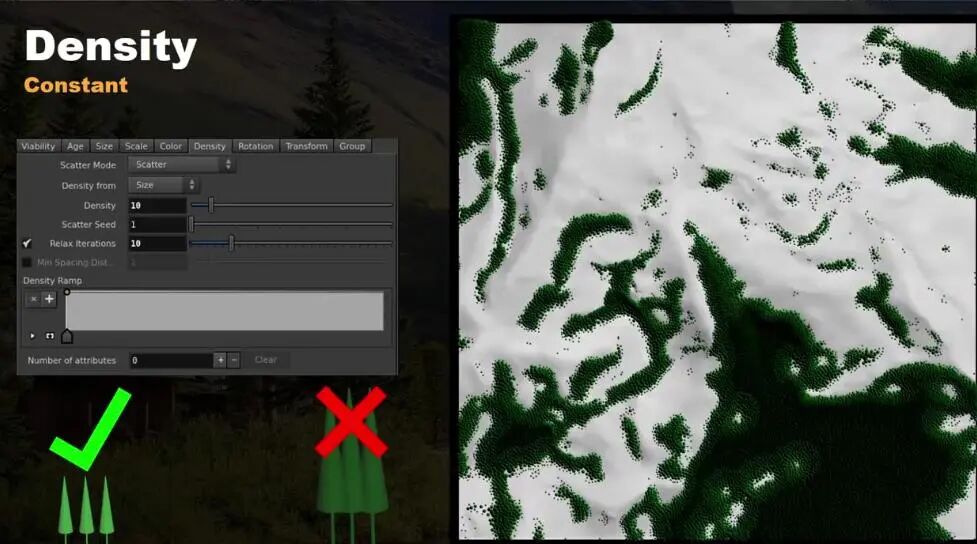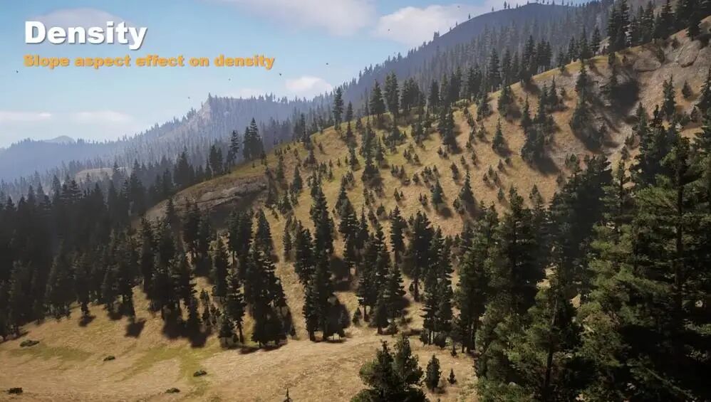 我们需要控制的另一个重要因素是这些树木的密度,如果采取同样的密度,那么小树之间的距离可能看起来比较自然,但对于高大的树木,就会显得很拥挤,而且我们为不同树木做的资源也会导致不一样的性能开销,比如小树占用的GPU比大树低,因此控制不同类型树木的密度也很必要。