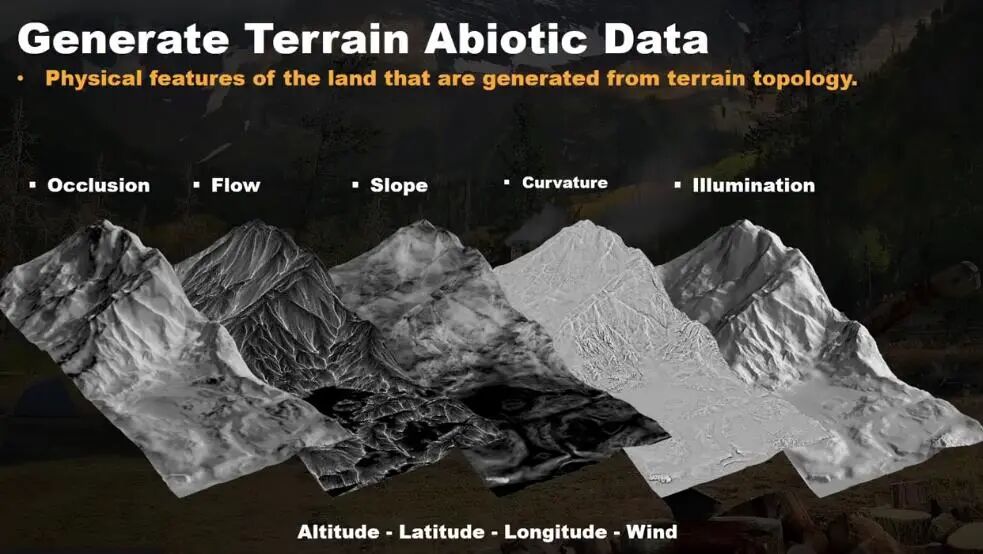 然后,从地形拓扑我们生成了Abiotic Data,也就是这片土地的物理特征。