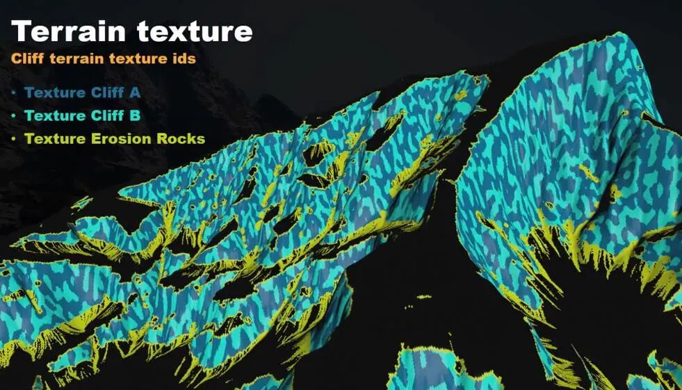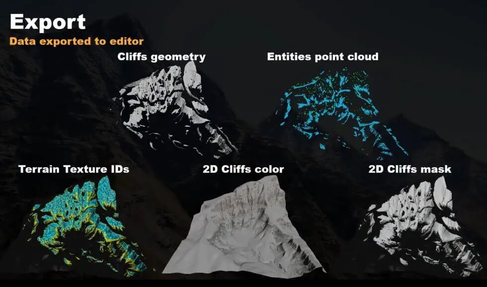 最后,这些是通过Cliff工具传输到编辑器的数据,包括几何体与碰撞,还有岩石与斜坡上生长的树木entities point cloud,有地形纹理ID,还包括地形上的悬崖颜色以及cliff mask。