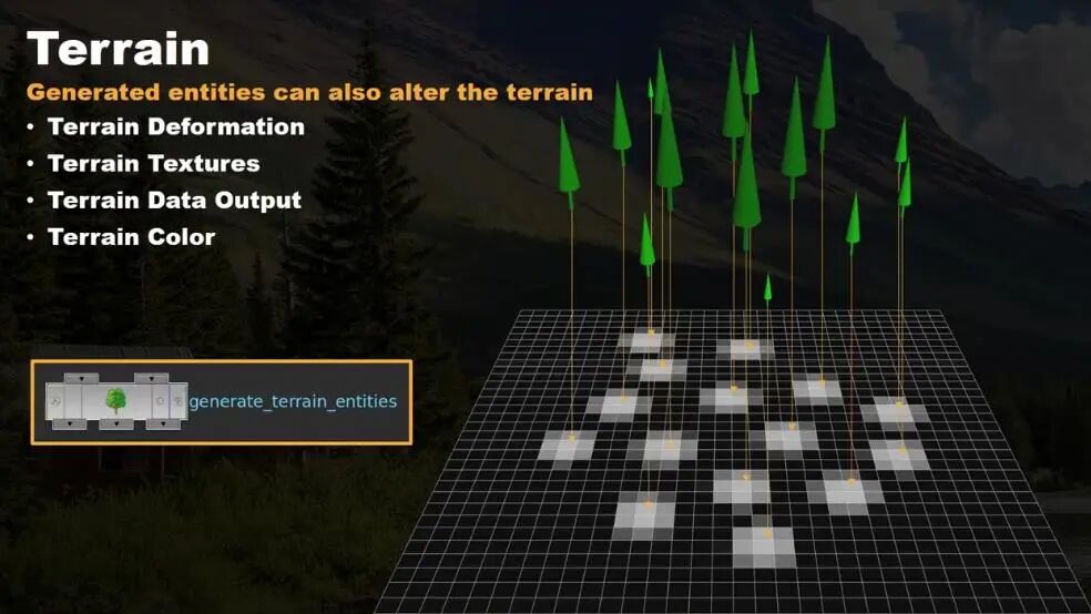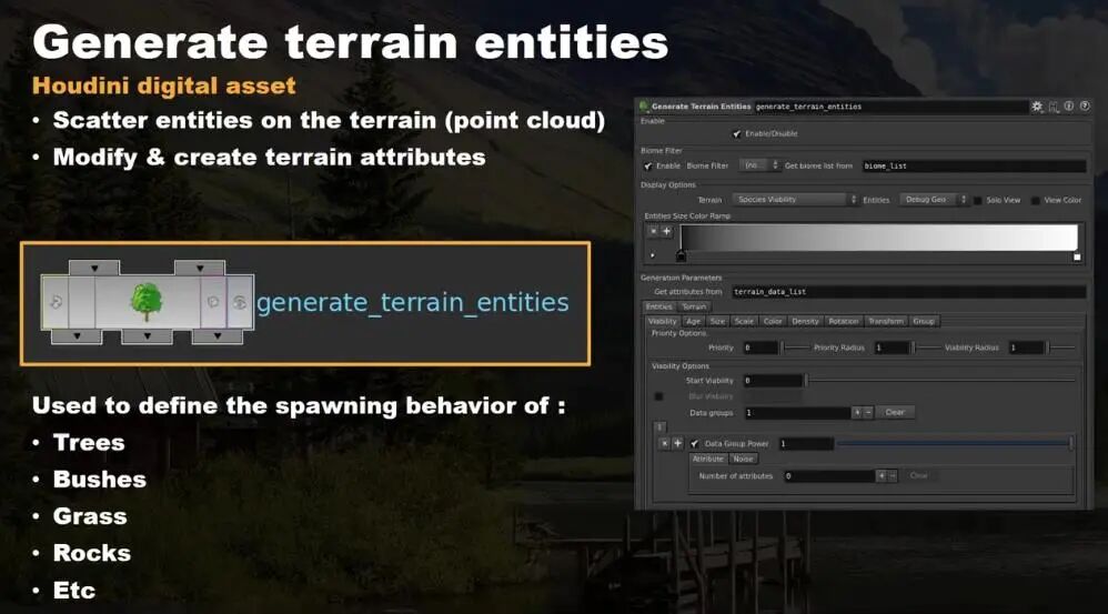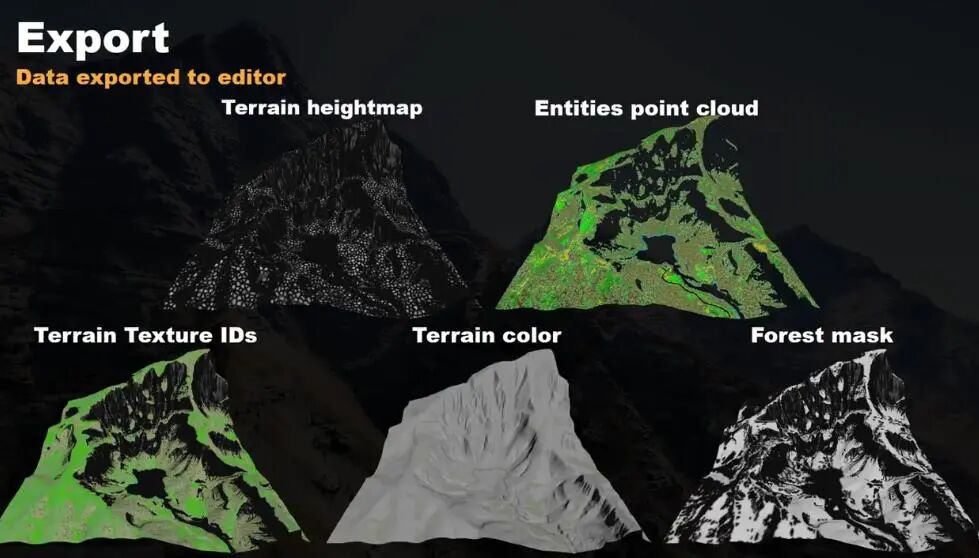 最后,我们从Houdini将数据传送到编辑器里,包括entities point cloud、地形高度图、地形纹理id等等。