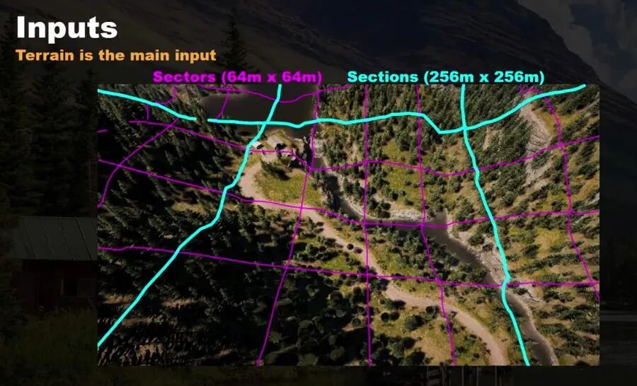 不过,程序化工具最主要的输入还是地形本身,因为生成是在地形上的特定区域完成的,所以地形是被分为很多小扇区(sector)的,也就是图中的粉色部分(64mx64m),当用户想要使用工具的时候,这是他们可以调整的最小区域。