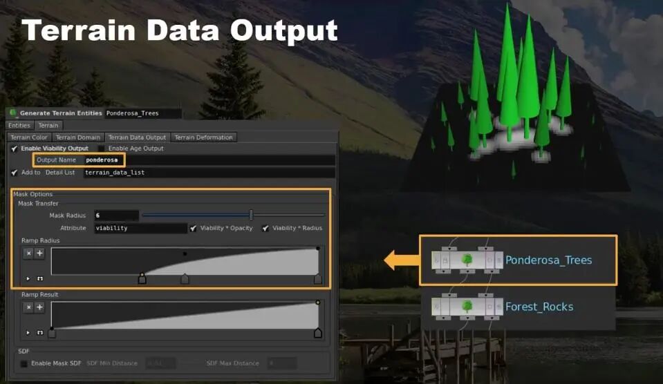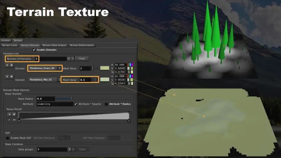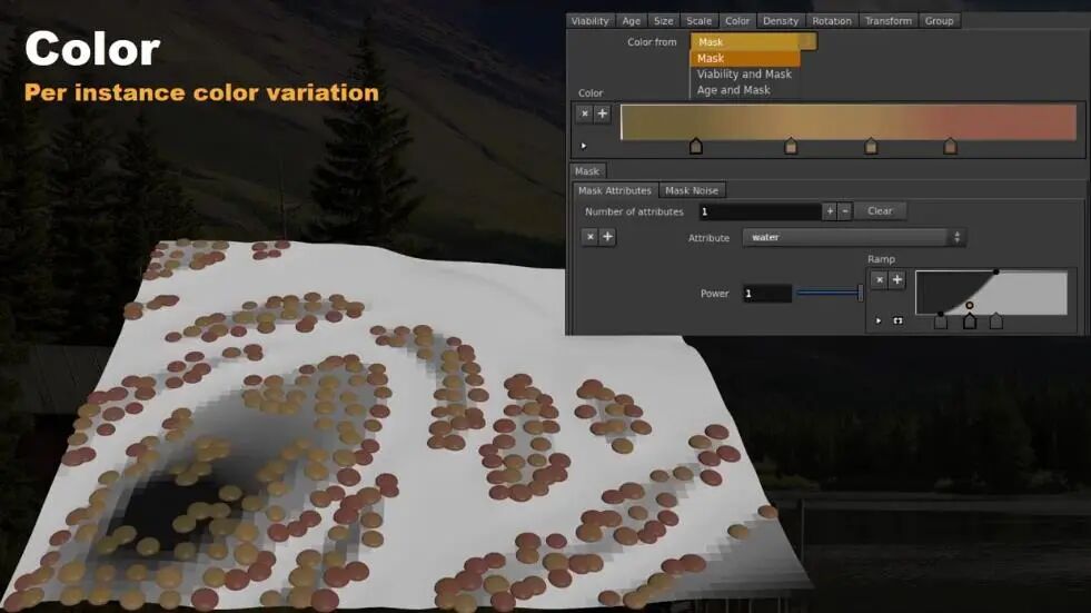 接下来,我们或许还想要给树木添加额外的东西,可以通过树木生成attributes的方式实现,不过,这时候mask会存储于地形上,我们可以设置自己想要的参数和范围。