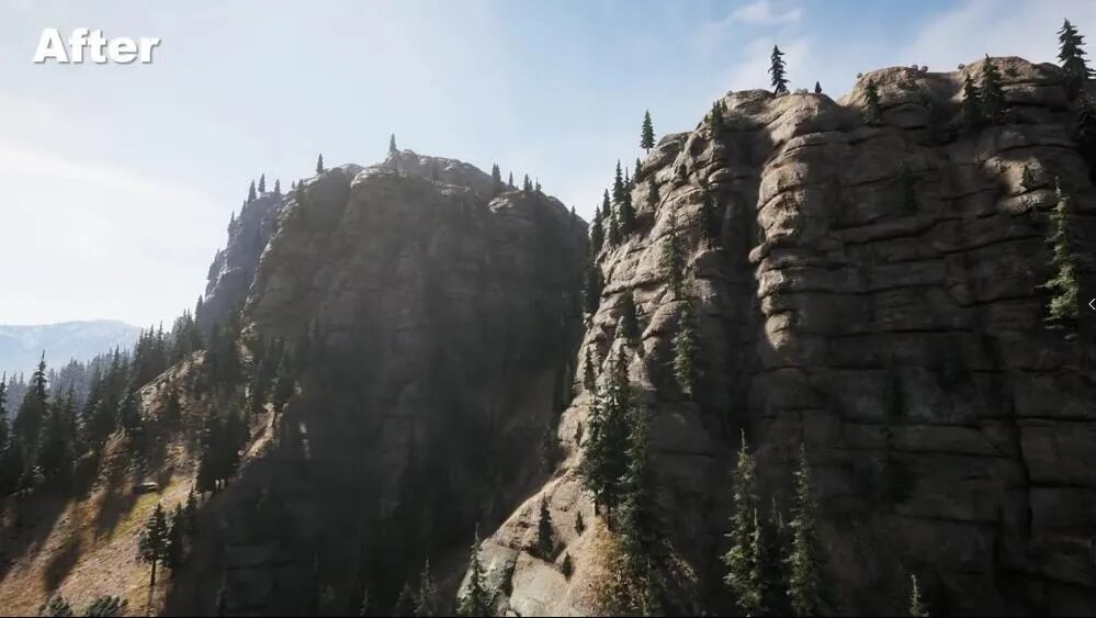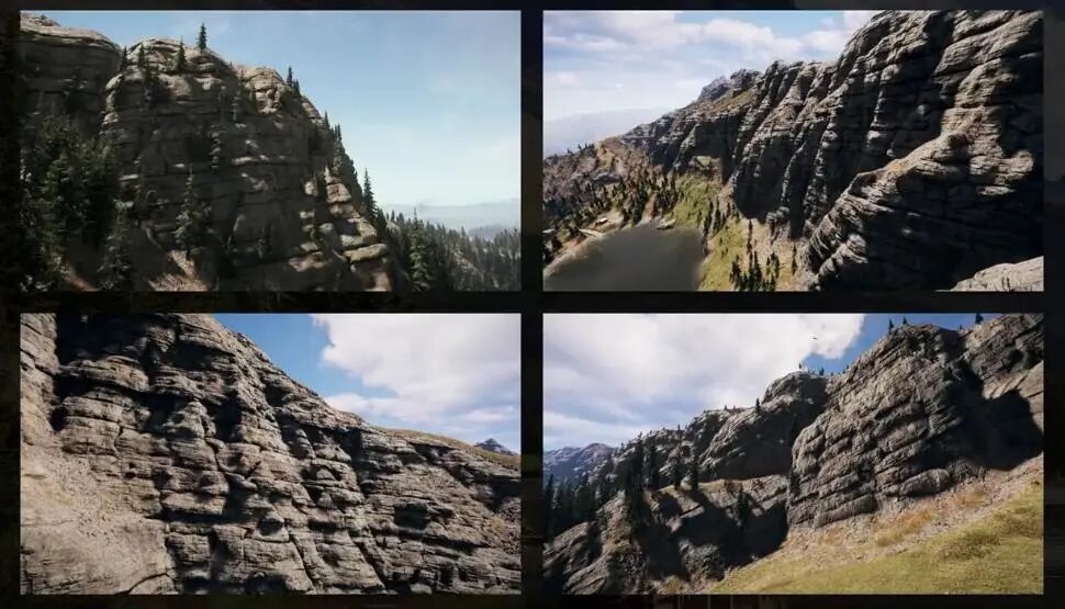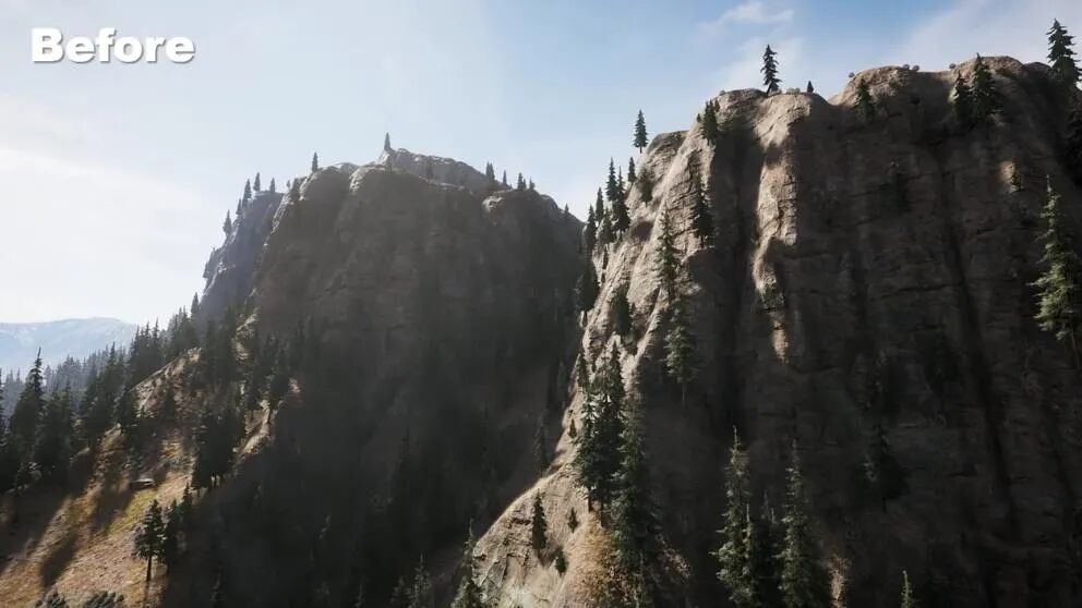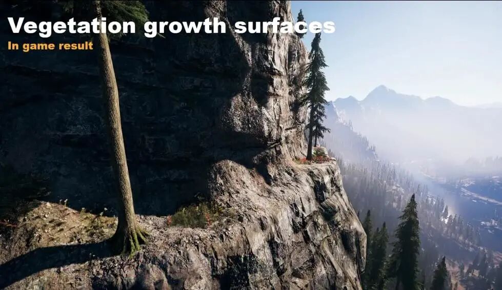 实际上,孤岛惊魂系列之前没有用过这样的工具,在《孤岛惊魂4》以及之前,游戏里的悬崖就只是地形,虽然我之前没有在这些项目工作过,但通过这张图我们可以看出来,以前的项目没有对悬崖进行细节填充,因为手动做这些资源会让研发成本提高。