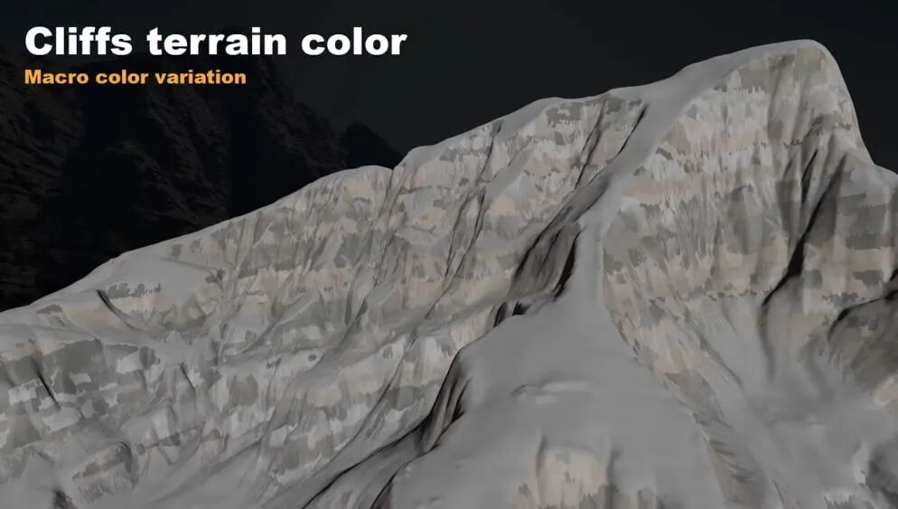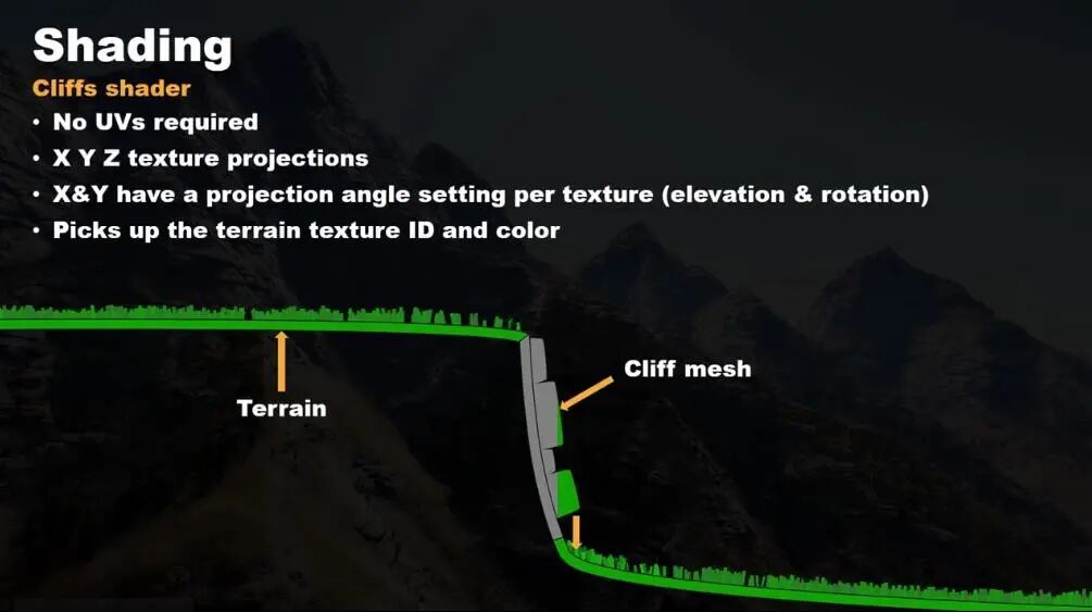 需要说明的是,悬崖是在游戏里着色的,我们使用了Terrain Shader,它可以用和地形同样的通道渲染物体,所以悬崖可以使用它底下地形同样的纹理。如果我们在悬崖下面有草丛,悬崖也会有一部分是草色,为了避免这种情况我们必须确保悬崖网格转换为它们底下的地形颜色。