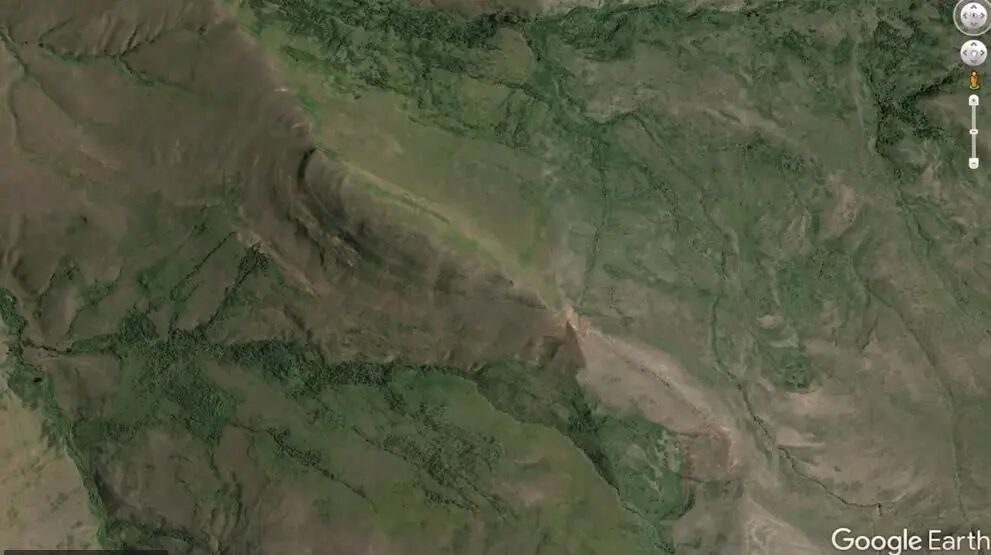 这是一张谷歌地球图片,比较有趣的现象是地形差异,可以看到干燥区域和湿润区域的绿色是不一样的。