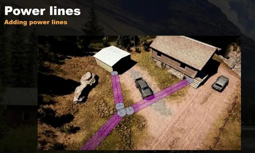 用户还可以在地形当中增加电线,这里我们可以增加两种相互连接的电线,所以我们增加了单条线和相连接的电线,如果用户没有对远处的地形设计电线,系统会自动生成电线。
