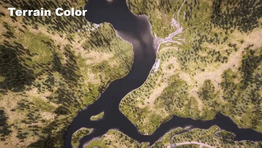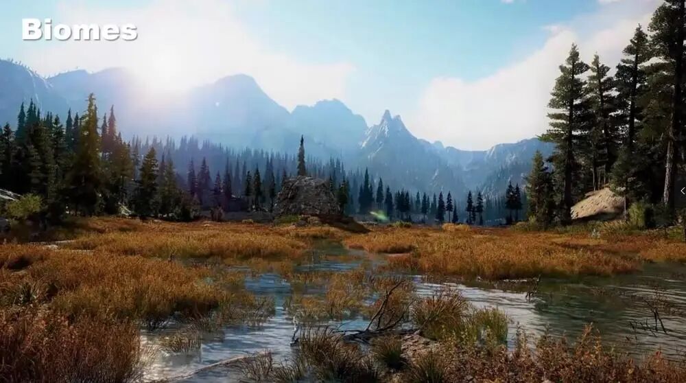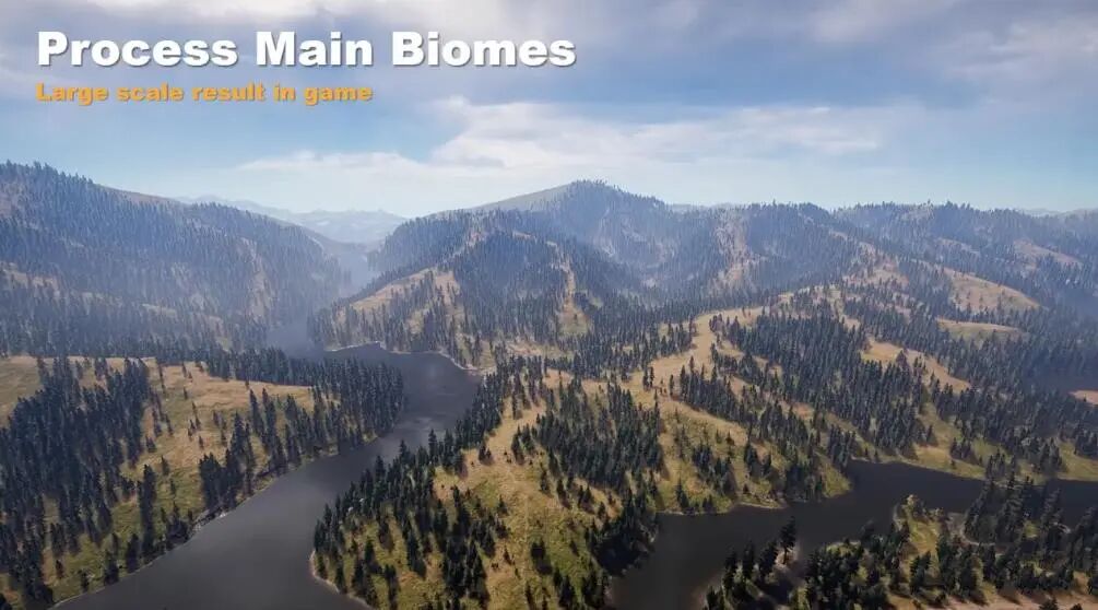 接下来,关卡美术师可以增加植被,主要是使用biome painter实现,然后biome工具就会在整个地形上自动生成合理分布的森林草木,而且它们还可以与水体资源互动。