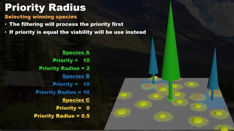 为此,我们设计了优先半径,所以首先会评估优先级,如果两个物种的优先级相同,我们这时候会采取优胜劣汰。比如在这张图中,蓝色树木的优先半径更长,而黄色物种的优先级是0,所以它会生长在离绿色树木较近的地方。不过,我们不希望它离蓝色树木太近,所以只要黄色草丛离蓝色树木距离太近,它们就会被移除。