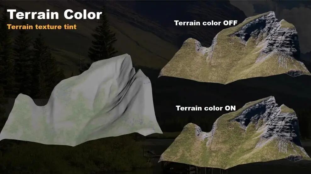 另外值得注意的是,以上提到的地形与植被颜色还可以用到草皮上,因为草丛着色器也可以选择地形颜色。