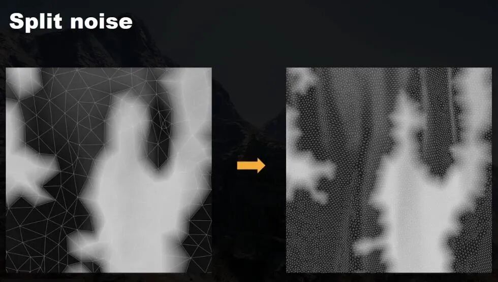 首先是做了一些噪点(noise)网格并将它们分为两组,实际上噪点是在比较低分辨率的网格形成的,然后转换到高分辨率网格,通过这些做更大面积的内容,我们发现如果做很很小的岩石或者悬崖,带来的效果不是很好。