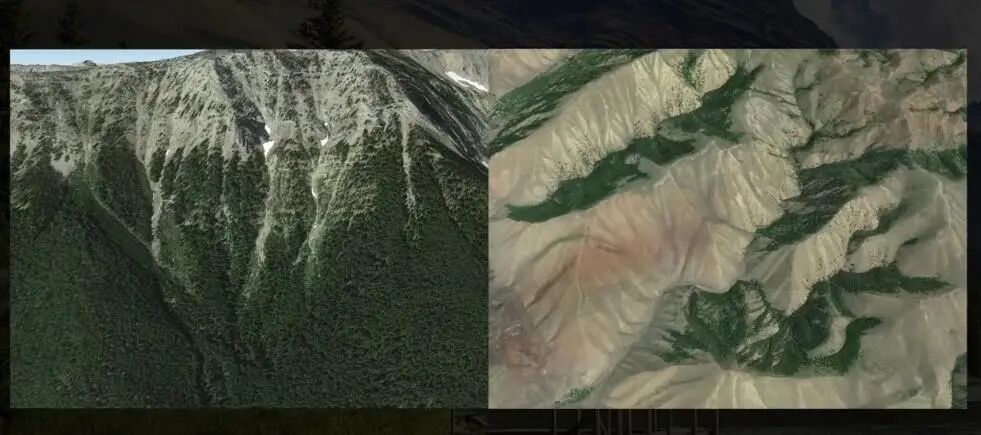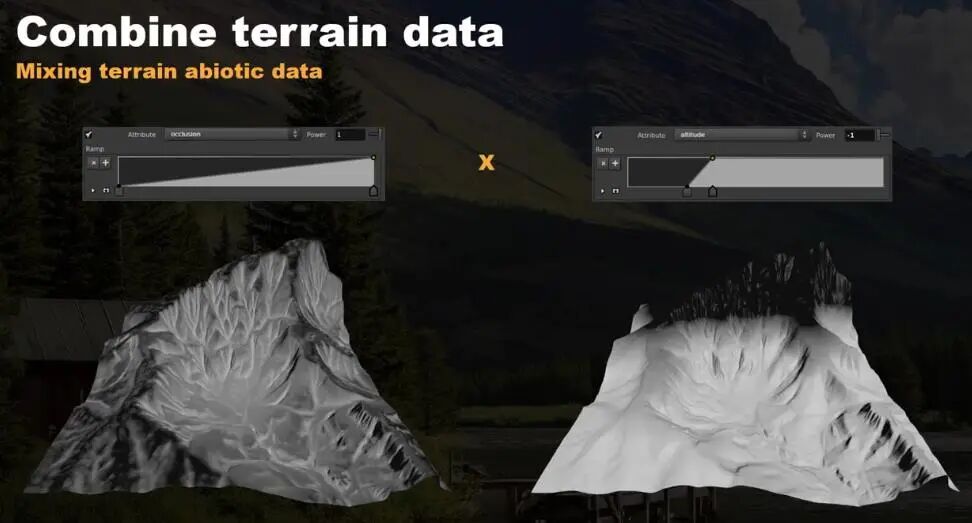 左侧图片中,在流动的线上没有任何植被,右侧的图中,山脉的盐碱表面几乎没有任何植被。为了模仿类似的事物,我们需要将不同的地形数据结合起来。