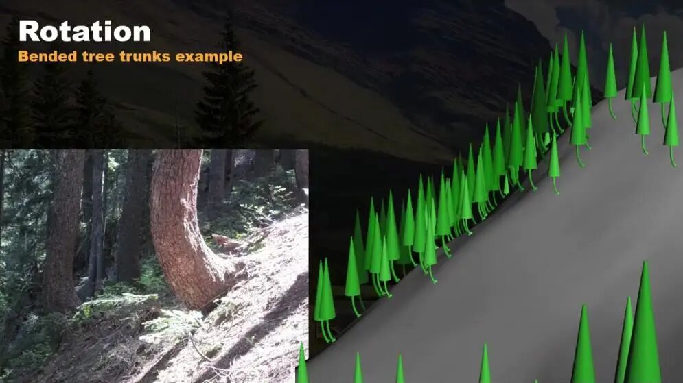 另外一个案例,就是树干的弯曲,你们可能在大自然中看到过这种现象,如果没有注意到,你们可以专门去观察。不幸的是,我们并没有在游戏里这么做,我很希望我们的系统能够允许这么做。