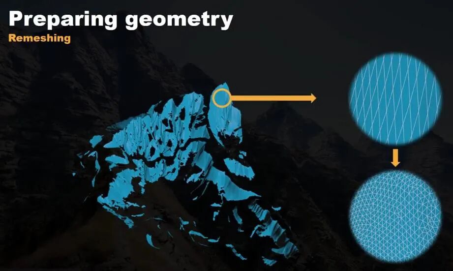 由于我们是在这样的几何体上开始,斜坡上就会有拉长的菱形,为了摆脱这种情况,我们对几何体上的通道进行remeshing,以得到统一风格的三角形。