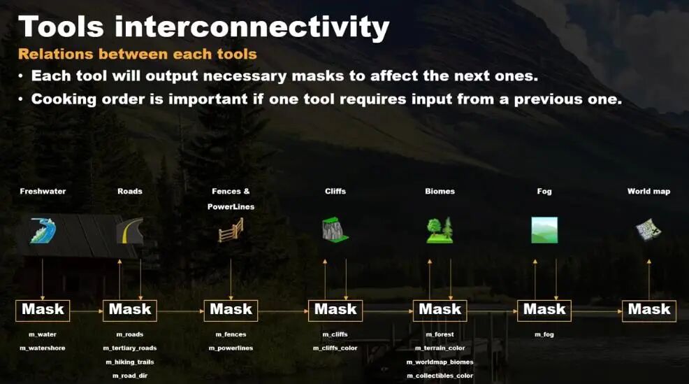 比如淡水工具会写一个water mask,随后的biome工具可以读取,以便在分布的时候考虑到水源。
