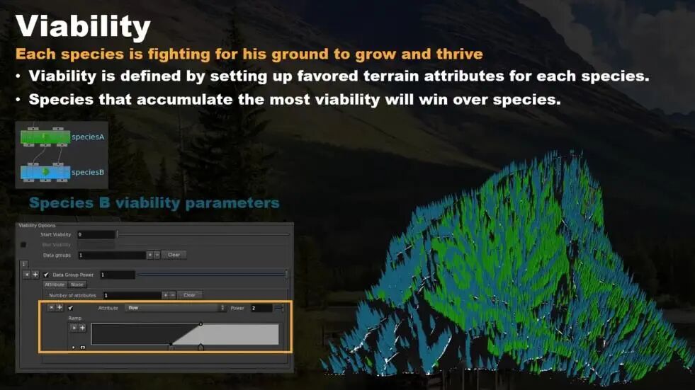每个物种都为它们的生长和繁荣而努力,生存能力就是为每个物种确定其最喜欢的地形属性。最适应地形生存的物种会(在这个地形上)胜过其他物种。