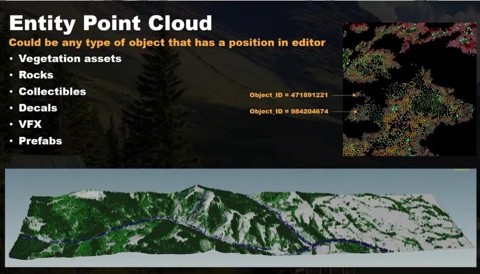 有些具体信息存储在Entity Point Cloud,比如某些物体的具体位置信息,植被资源、岩石、可收集物品、decals以及VFX特效数据、预制建筑等,甚至可以是环境中的动物,这些物体都有对应的ID以便精准做出调整。