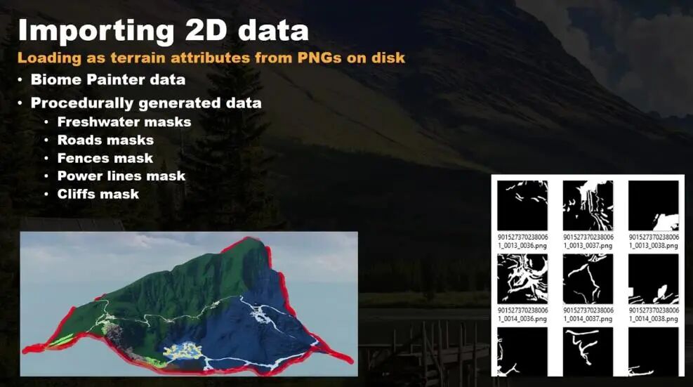 完成这些之后,地形数据会存储在terrain attributes上,我们还引入其他2D数据,以便让用户通过工具生成的Biome Painter数据与程序化生成的数据一致,比如淡水、路径、栅栏、电线、悬崖等。