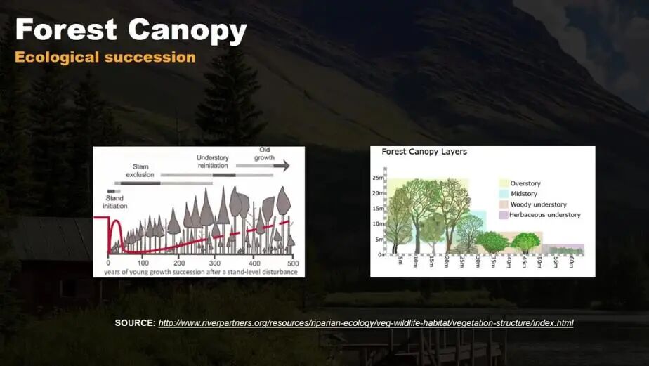 我们再来看另一个现象,也就是树冠的生态演替,前面提到,小树往往位于森林边缘,但有时候也有些会分布在森林中间,当你走进森林的时候,你会发现一些小树也已经开始生长,并且已经达到一定高度。